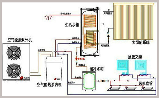 系統(tǒng)采用空氣能熱泵輔助太陽能,或電輔助太陽能,或單獨(dú)空氣能熱泵帶動,結(jié)合地暖、風(fēng)機(jī)盤管(立式或者吊頂)實現(xiàn)冬季采暖;
