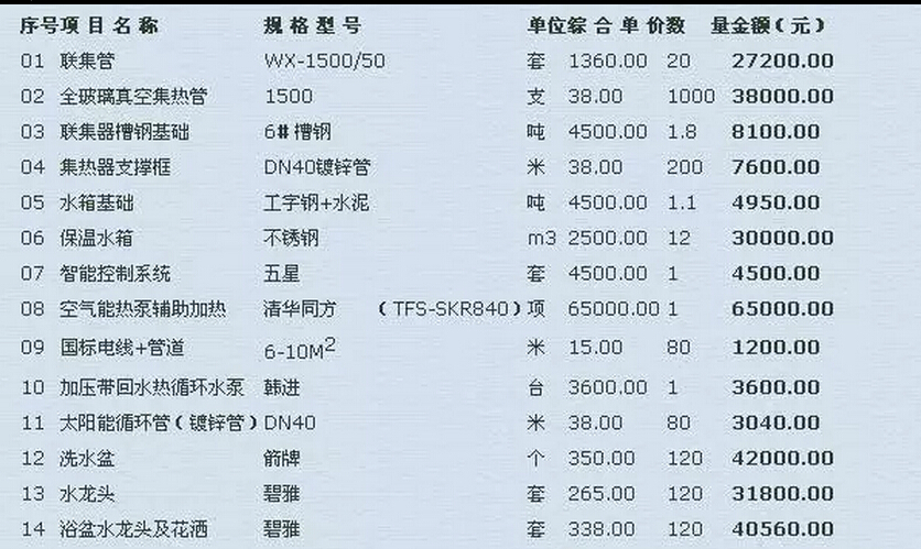 其中包括:聯(lián)集管(27200.00)、全玻璃真空集熱管(38000.00)、聯(lián)集器槽鋼基礎(8100.00)、集熱器支撐框(7600.00)、加壓帶回水熱循環(huán)水泵(3600.00)。